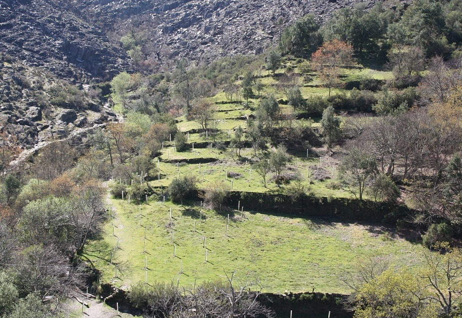 The site occupies a total area of 1 ha. The tree species selected for reforestation were cork oak (Quercus suber), pyrenean oak (Quercus pyrenaica), Birch tree (Betula celtiberica) and Ash tree (Fraxinus angustifolia). We used tree shelters to protect and increase the success of the seedlings, considering the presence of livestock that uses this land for grazing.